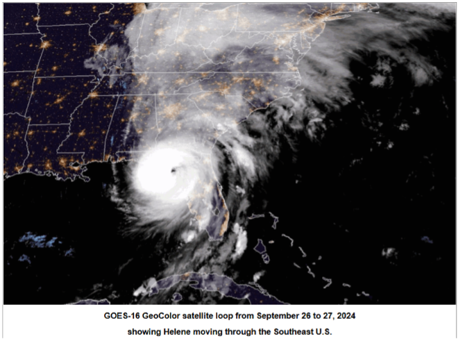 Late on September 26, Helene made landfall with maximum sustained winds of 140 mph near the city of Perry in the Big Bend region of Florida. Rapid weakening occurred as the storm tracked inland, and by the time Helene reached Georgia the next day, it had weakened into a Category 2. Weakening further, it became a tropical storm over east central Georgia a few hours later.